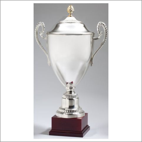Silver Plate Italian Cup with lid and acorn figure on rosewood base. Available in 3 sizes.