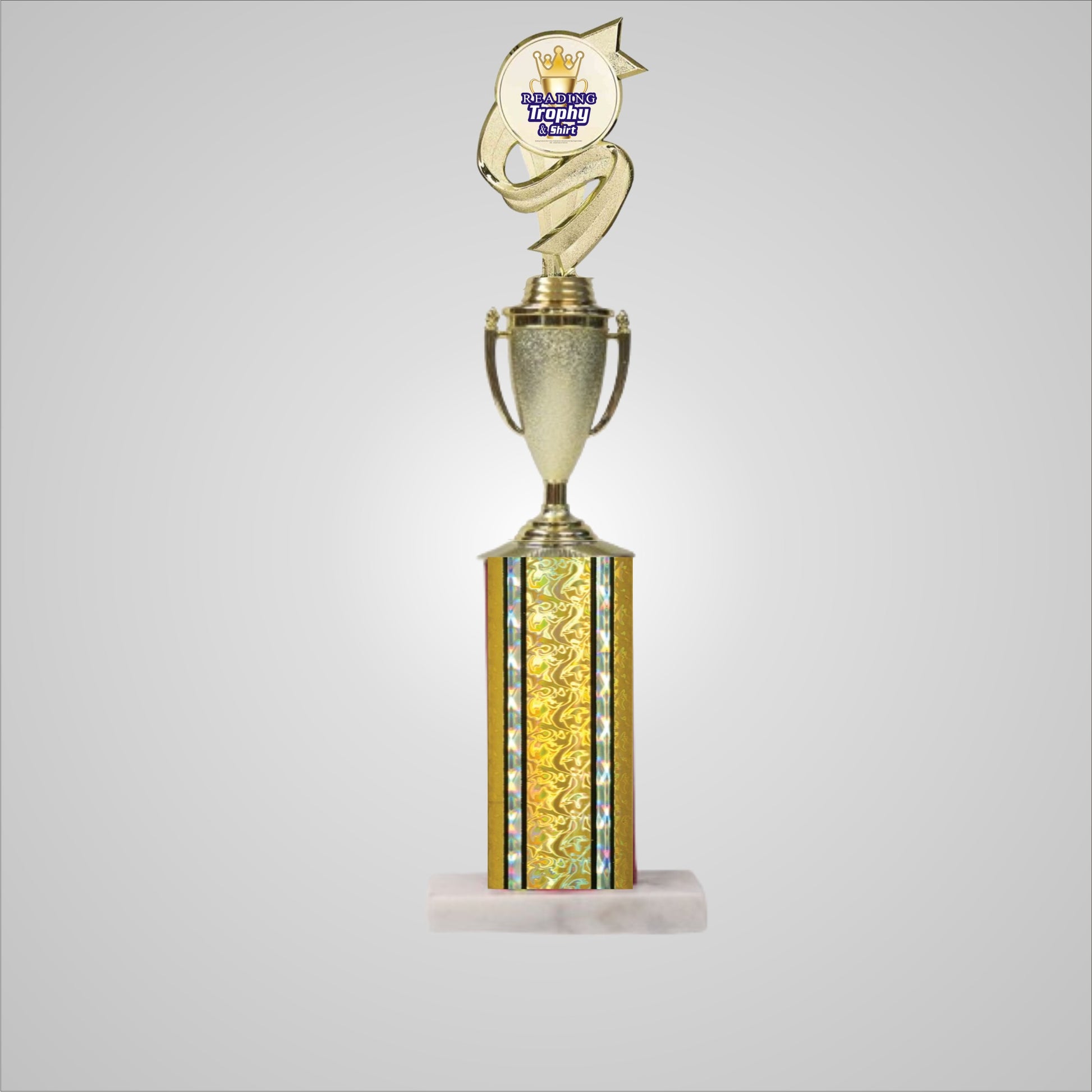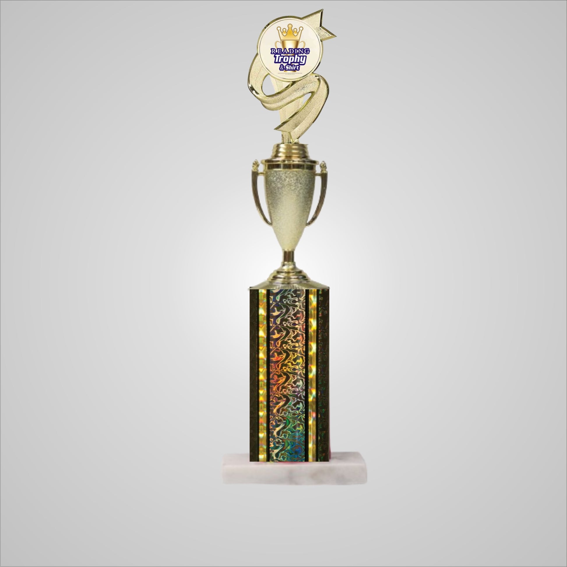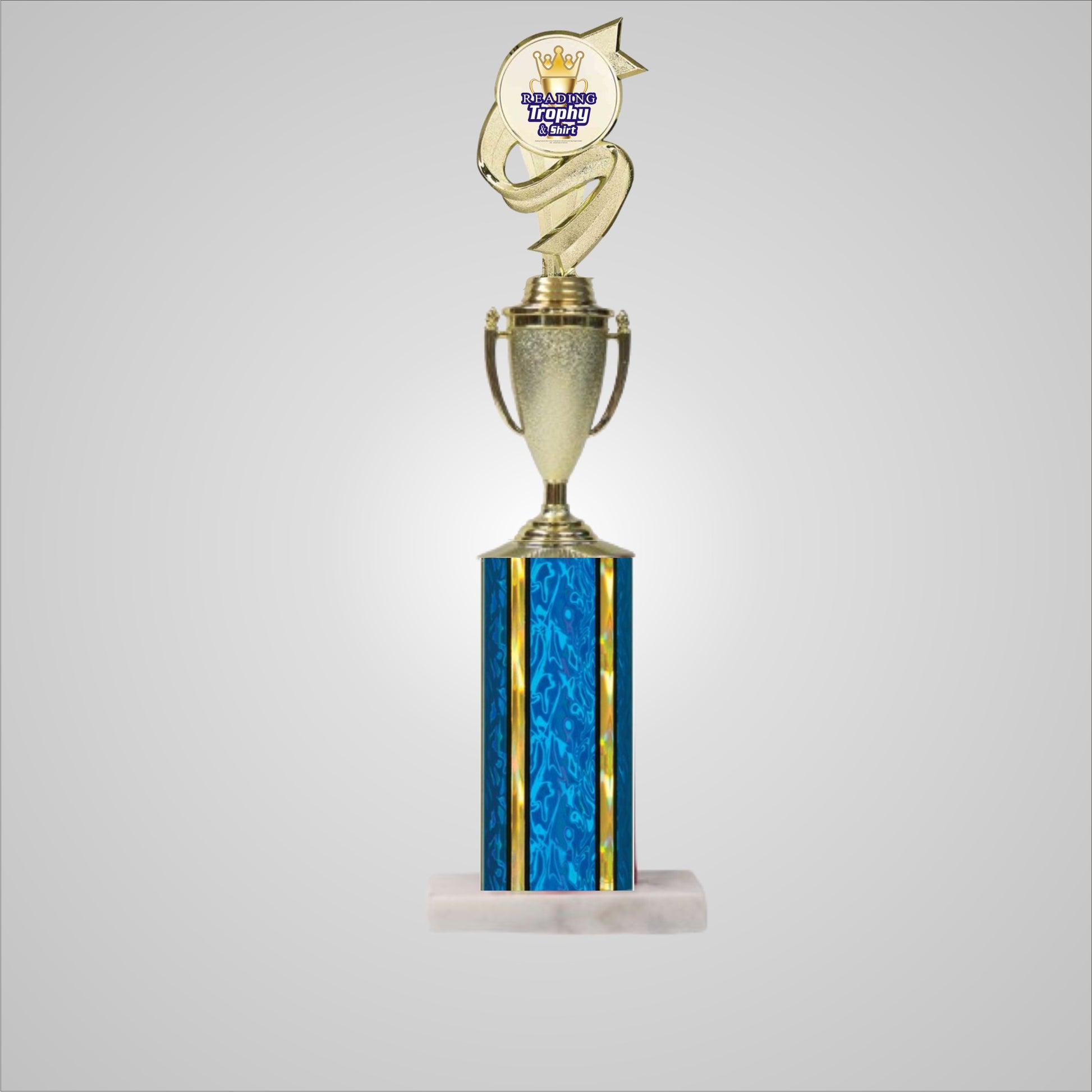 2.5"x5" marble with a 6" wide trophy column and figure on top of a cup.
