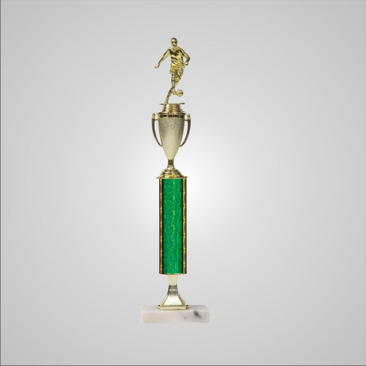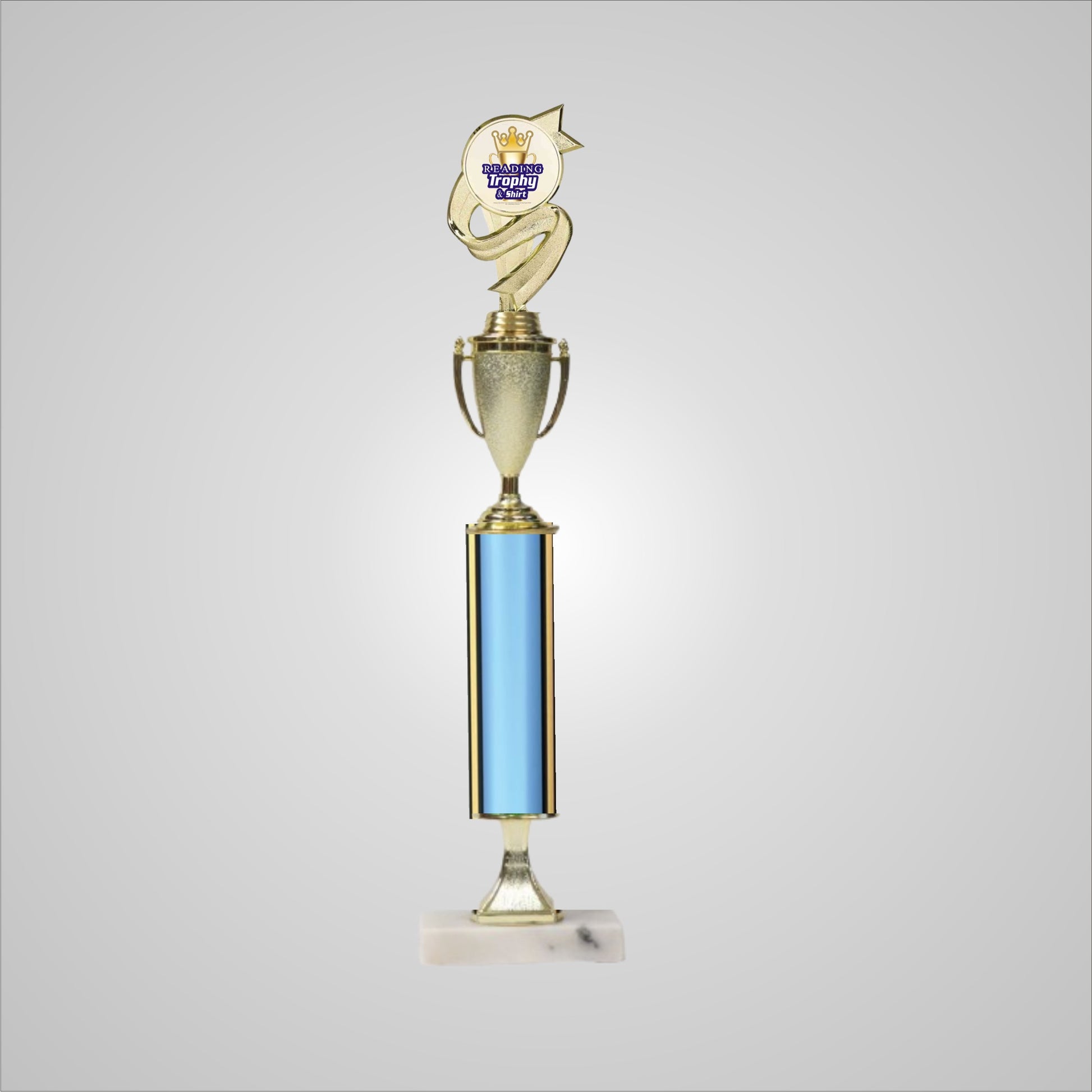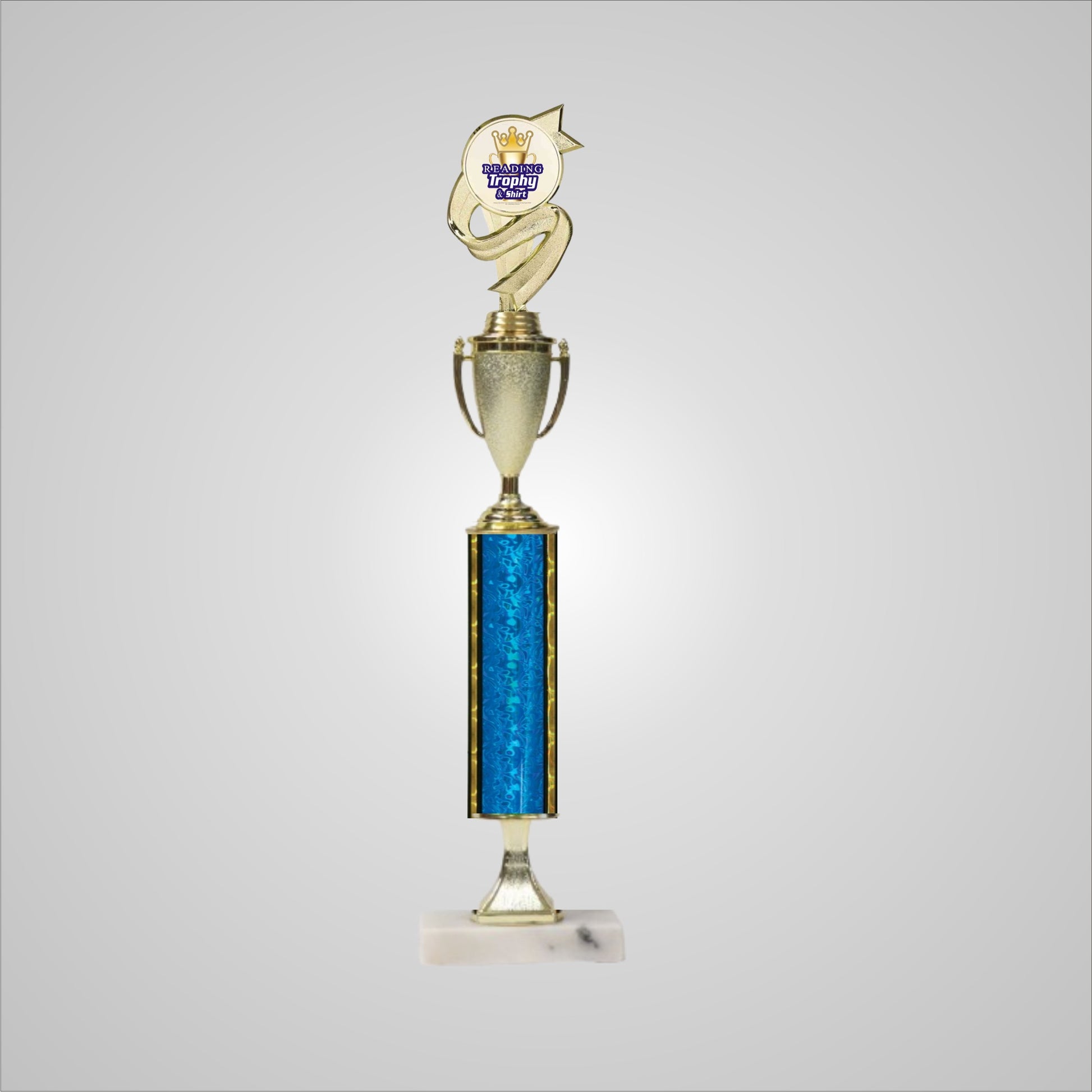 2"x4" marble with a 6" trophy column with riser on bottom and cup and figure on top.