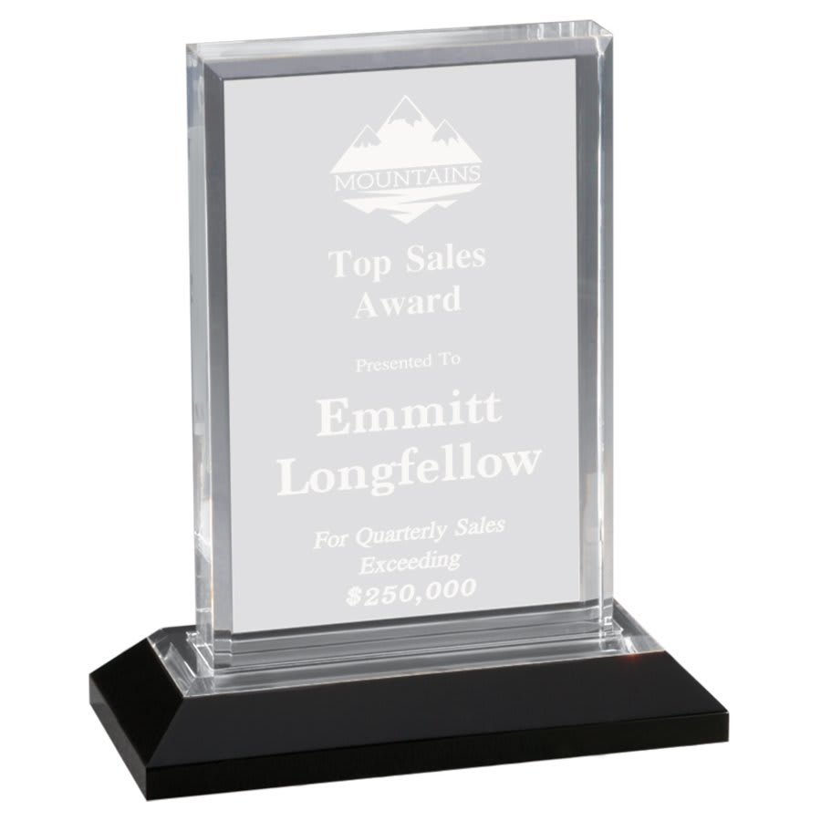 Make a big impression with the Impress line of Premier Acrylics Awards. Beveled Impress Acrylics come with a colored mirror base. They are 1 inch thick and size includes the base. They come in 3 different sizes and 3 colors- blue, gold and silver.
