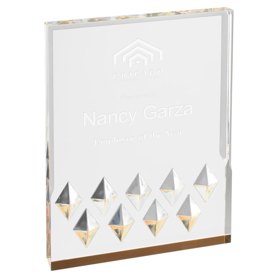 Diamond Mirage acrylics are self-standing and 1 inch thick. They come in 3 colors- blue, gold and silver, with 3 different sizes for personalization. The diamond embellishment adds a touch of elegance.