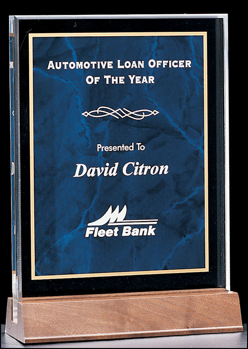 Clear Rectangle Acrylic with a Blue, Green or Red Marble center on a walnut base