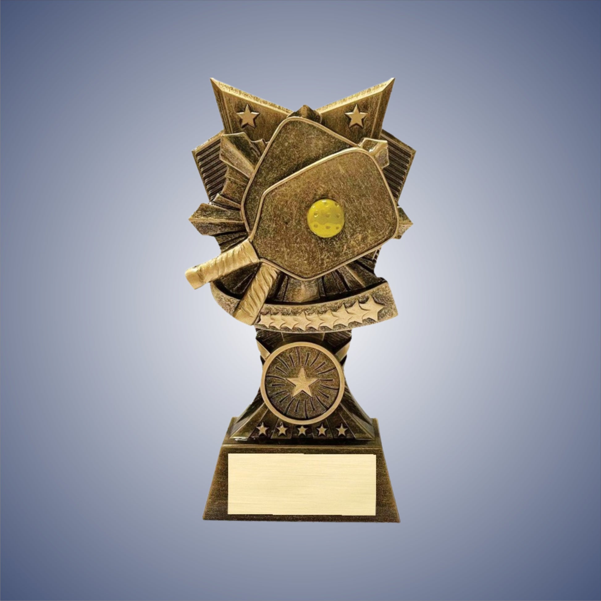 Bronze and gold Pickleball resin with a yellow ball on two rackets with bronze base with gold stars