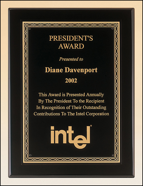 Black piano finish plaque with a black brass plate and gold braided design border. Available in 4 sizes.