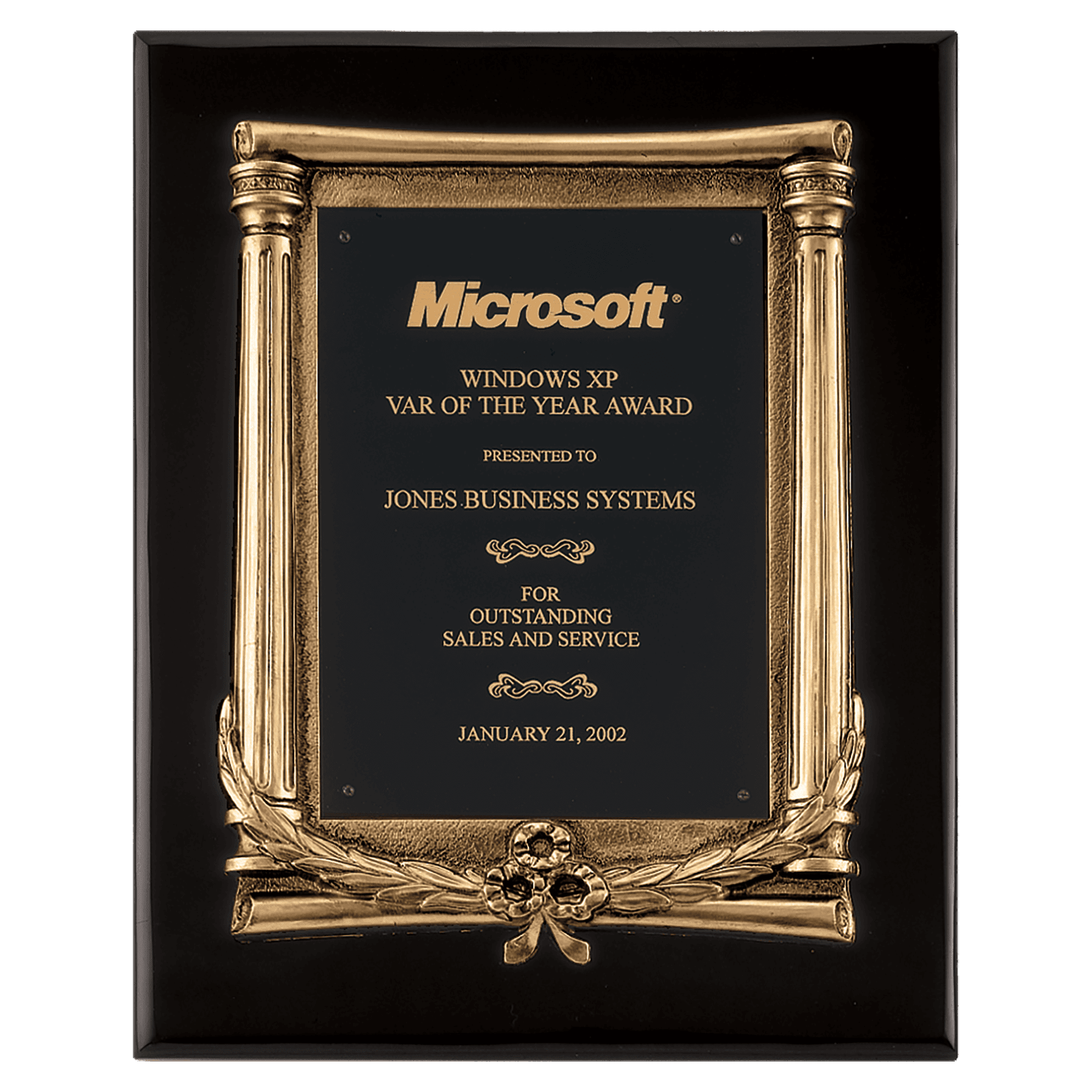 10.5"x13" black piano finish plaque with an antique gold finished frame with columns and black brass engraving plate