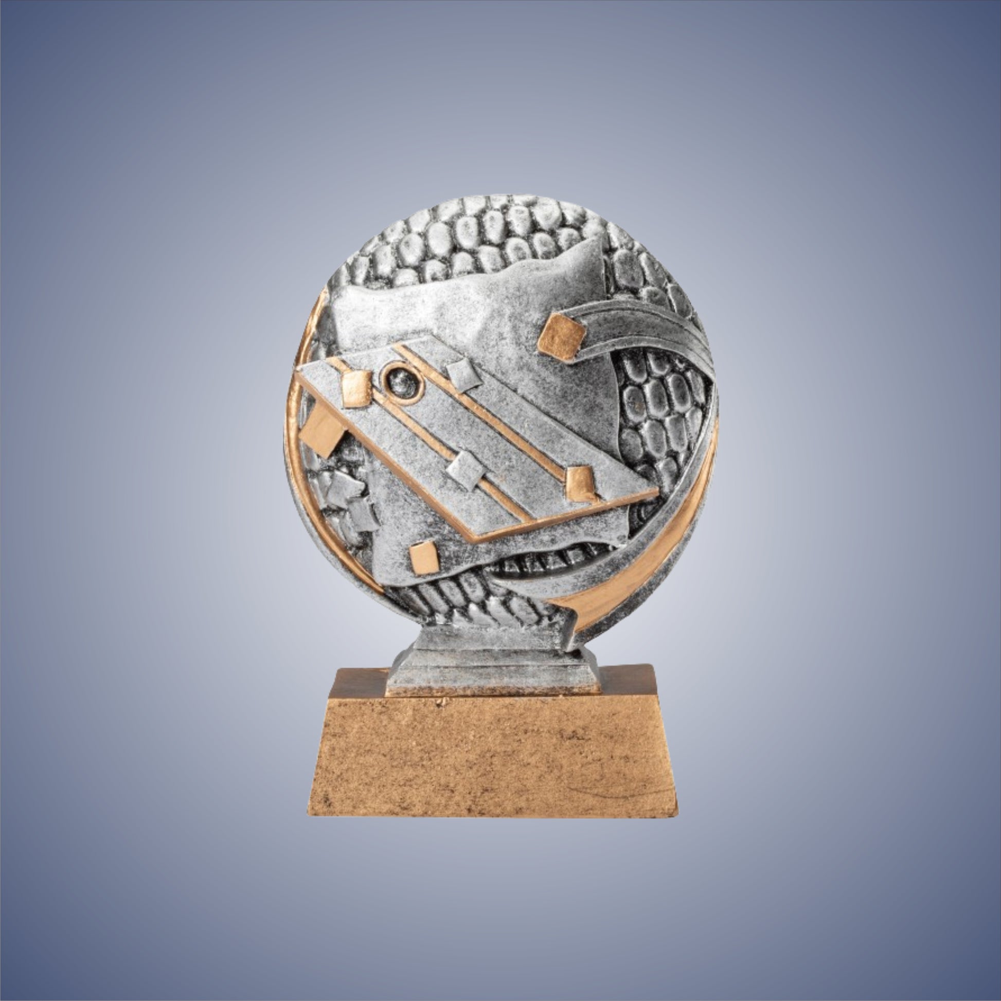 5" cornhole (bags) resin has silver corn textured back ground with a bag behind the board, and gold and silver bags on the board with a bag being tossed.