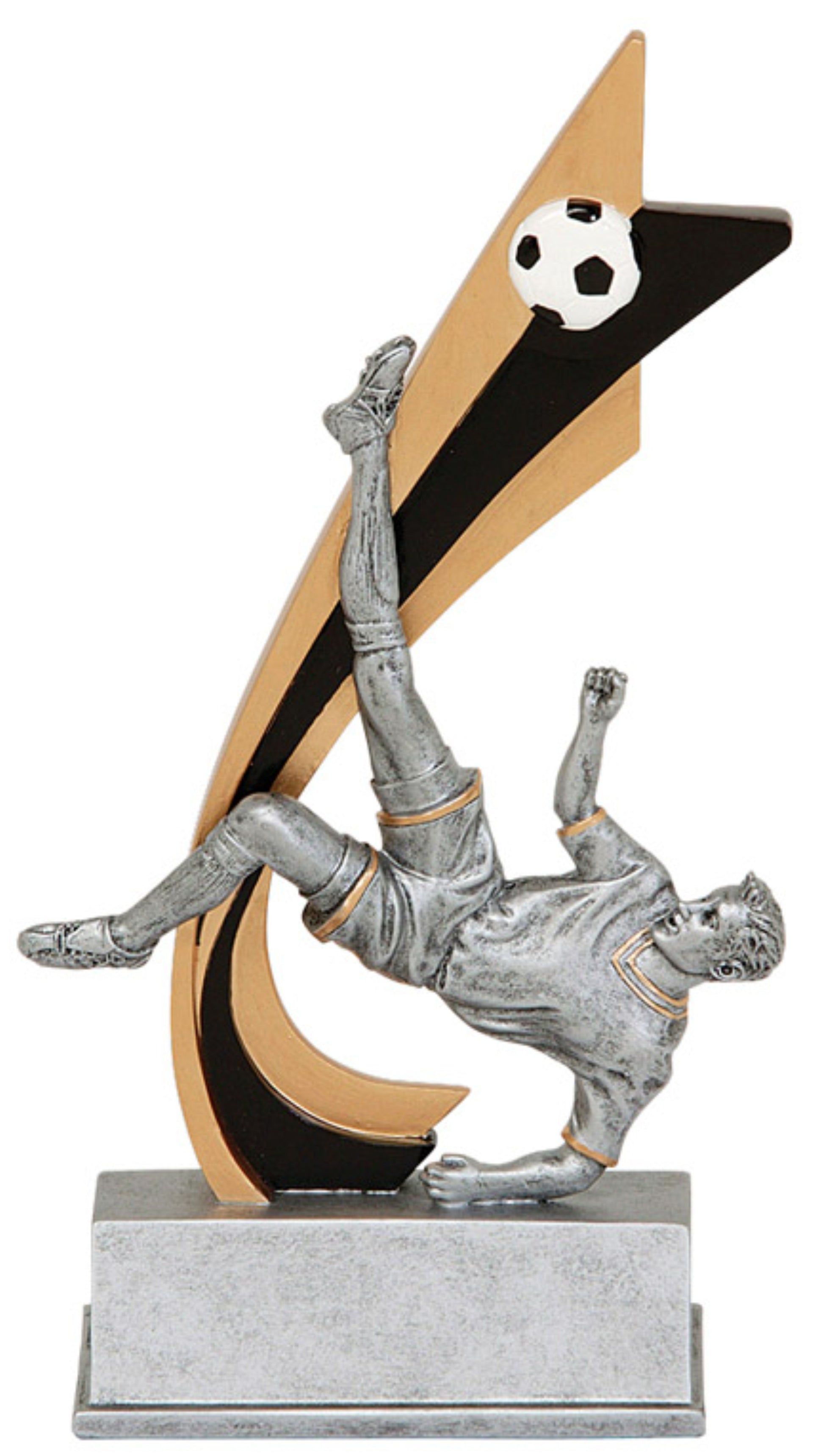 Silver and Gold 8" Soccer resin with player doing bike kick with black and gold background with black and white soccer base. Available in Male or Female