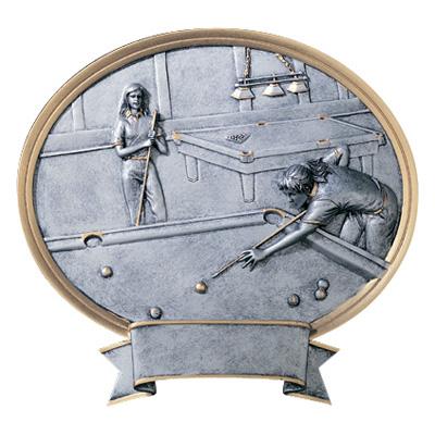 8" Billiards or Pool resin has 2 players, one lining up his shot will the other looks on, they are in a pool hall with another table seen in the background with the balls racked and lights hanging over the pool table. This award can be hung on a all or stand on it's own with the supplied kick stand.