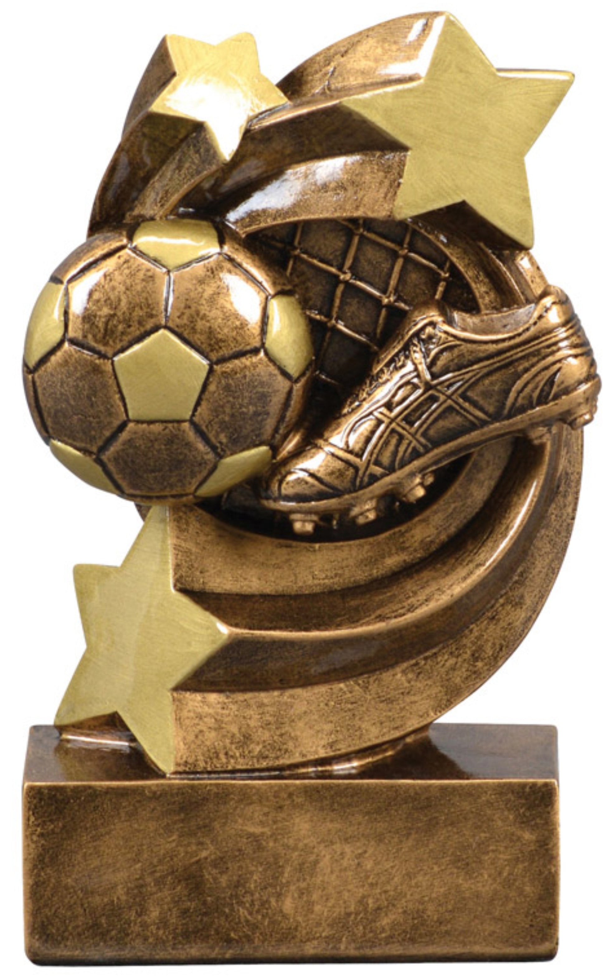 Gold and bronze Star Swirl Soccer Resin features a bronze cleat kicking the gold and bronze soccer ball surrounded by 3 gold stars.